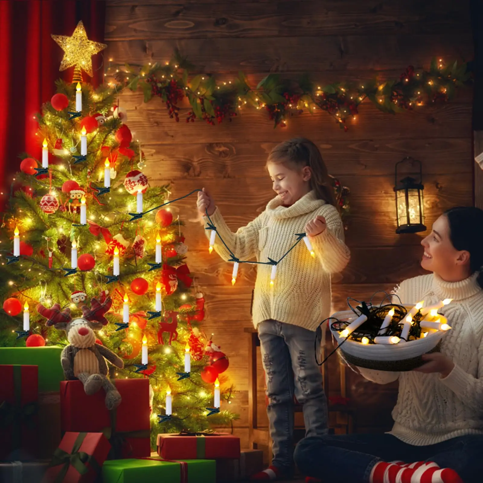【Realistic Clip-On Tree Candles Lights:】 LED classic Christmas candles cream white flameless candles with wax dripping appearance, acrylic candle tip, green Clip, and cord, adding a warm glow to your holidays and special moments