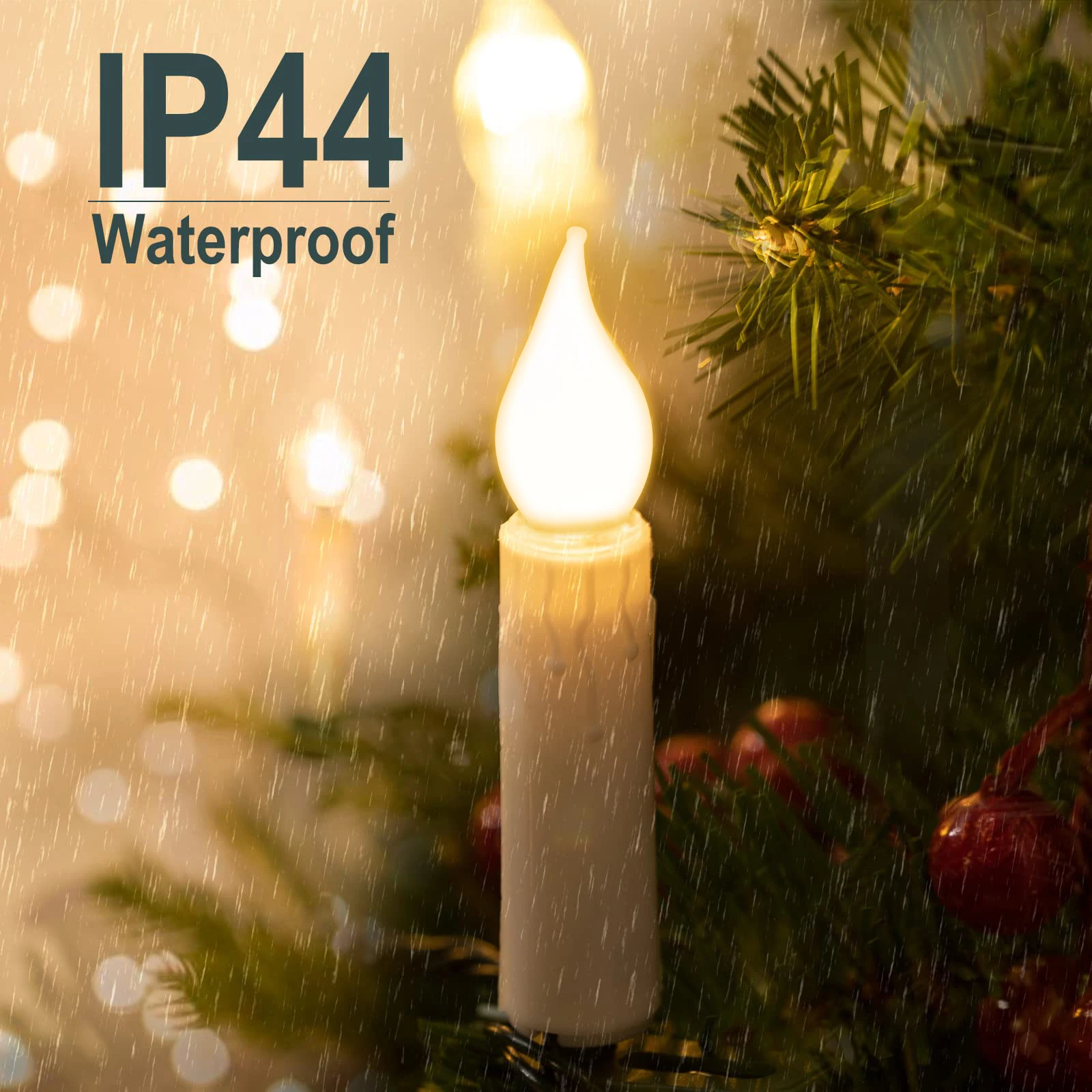 【Easy to Install: 】The clip-on candles can rotate 360 degrees, You can hang them on Christmas trees easily according to your preferences, not limited to angle. Just clip these realistic artificial candle string lights on your Christmas trees at any position and plug them in to light up no more difficult settings. IP44 is waterproof, (Suitable for light rain); 30 LED Candle Lights 8-Mode Light waterproof battery box. NOTE: 10/20LEDs Candle Lights The battery box is not waterproof, the power plug should be protected from water!
